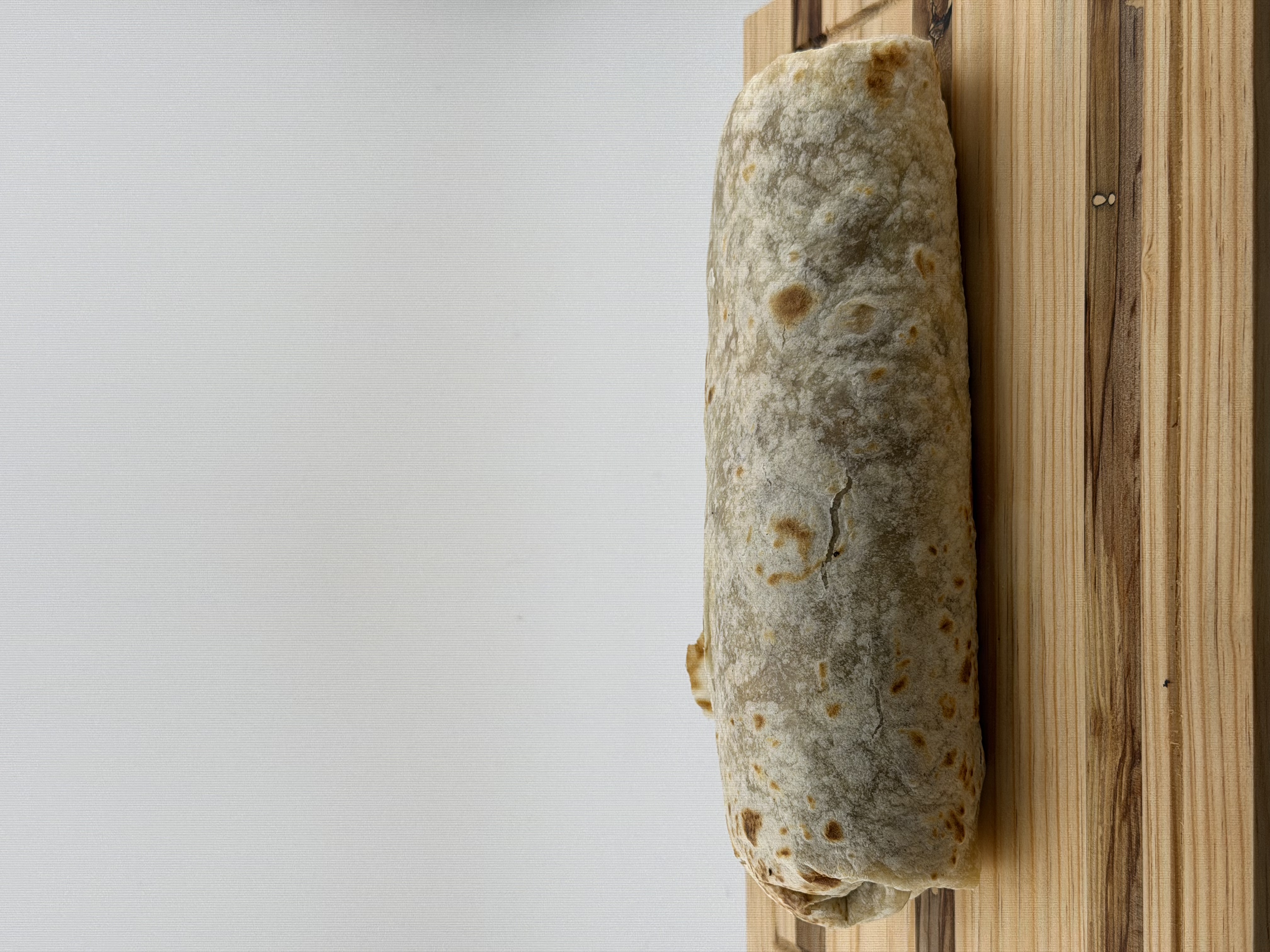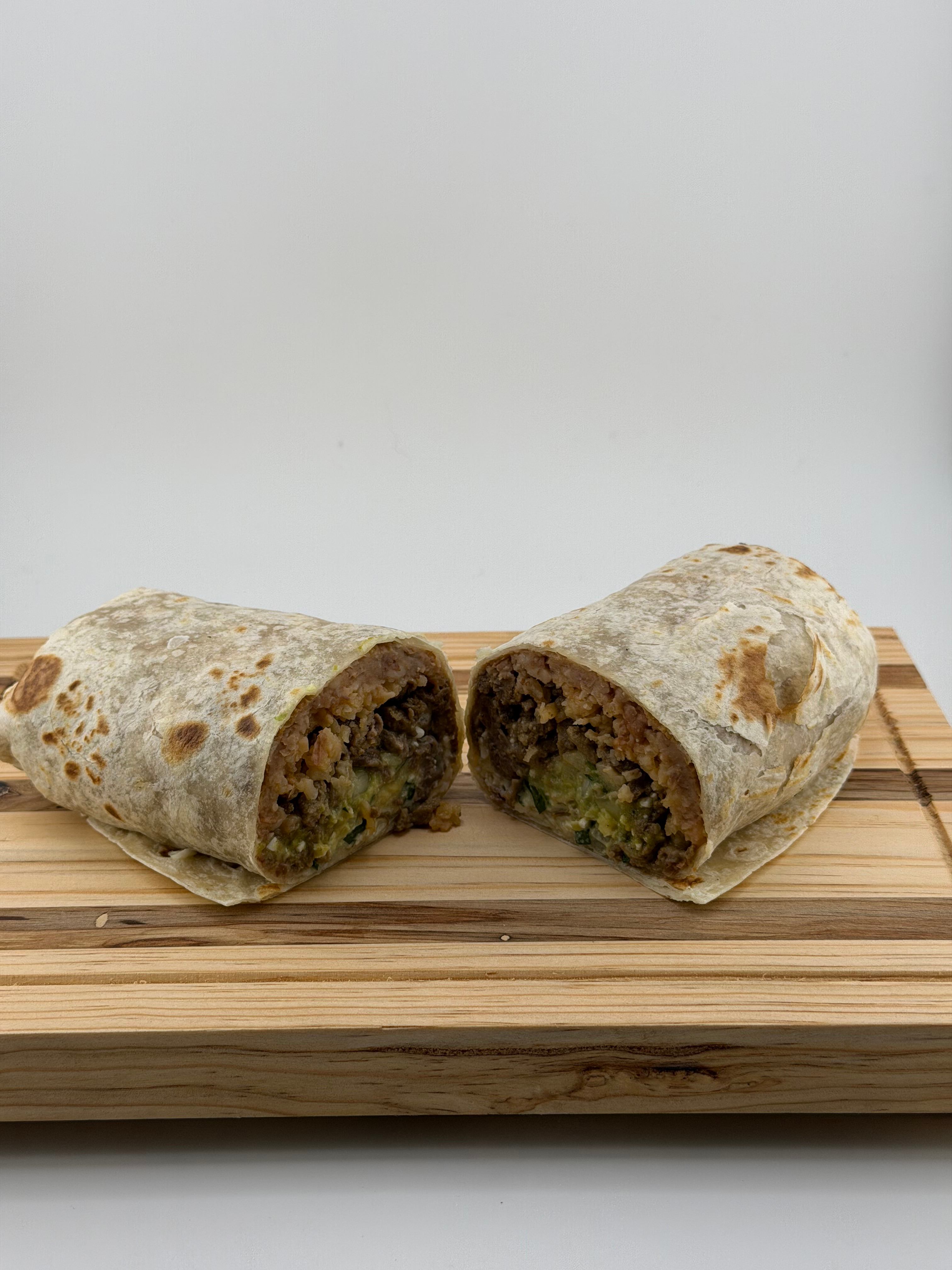 Tortilla de harina: Carne, arroz, frijoles, cebolla, crema, queso, aguacate, cilantro, y salsa.