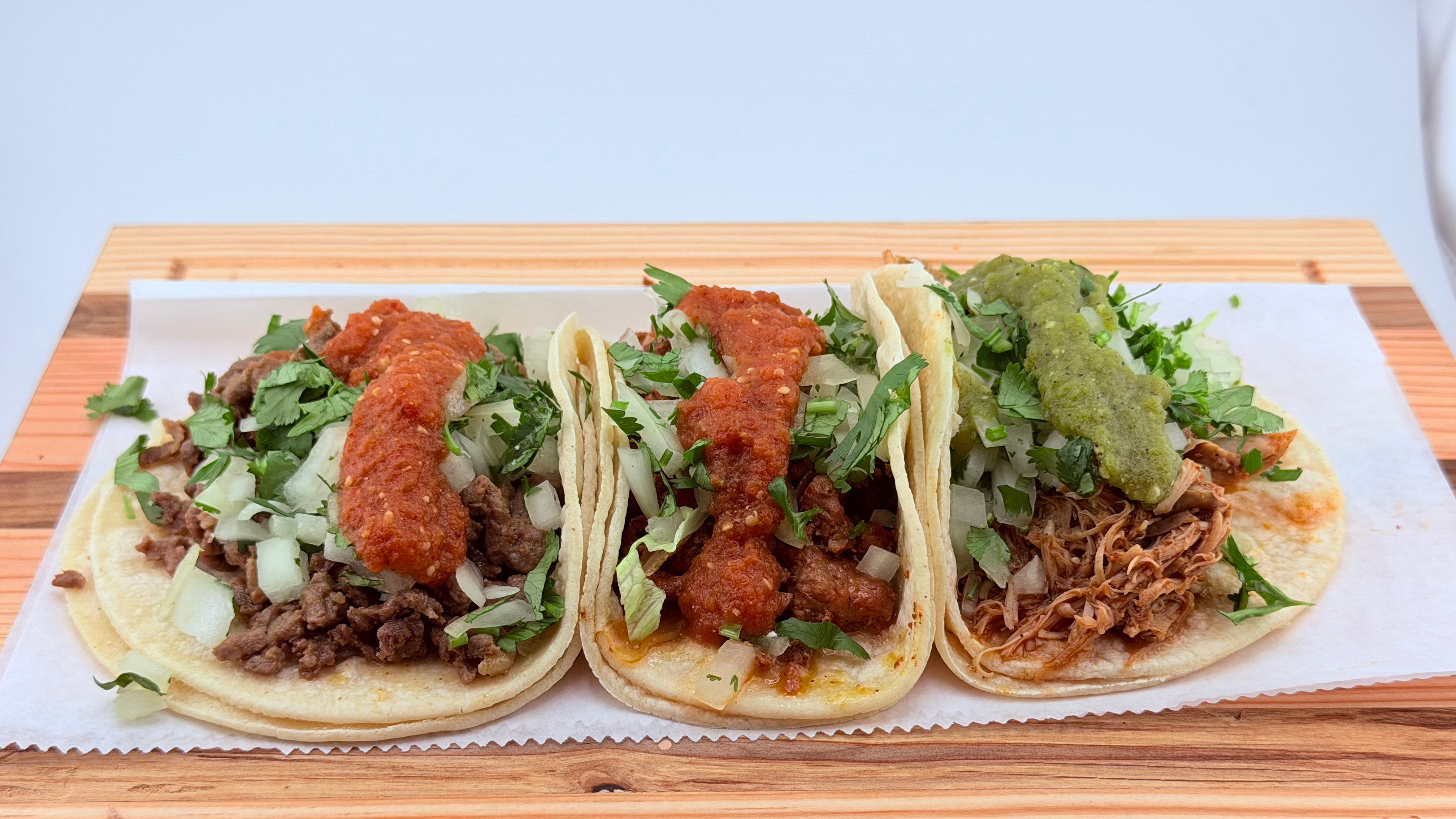 Carne, salsa, cebolla, y cilantro.