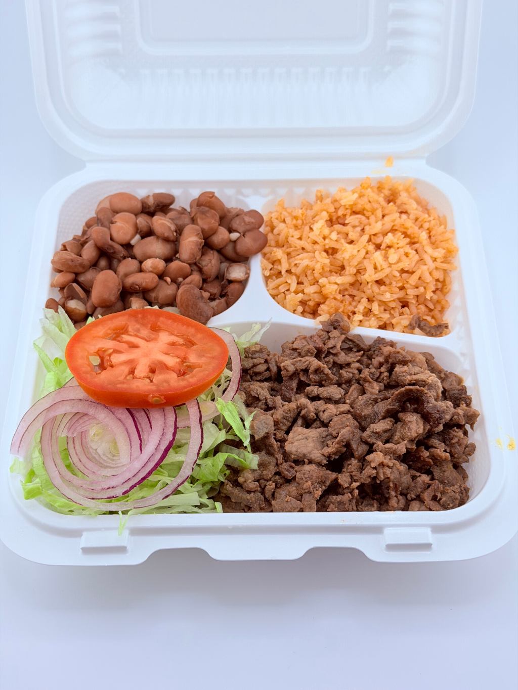 Choice of meat, rice, beans, salad and tortillas.