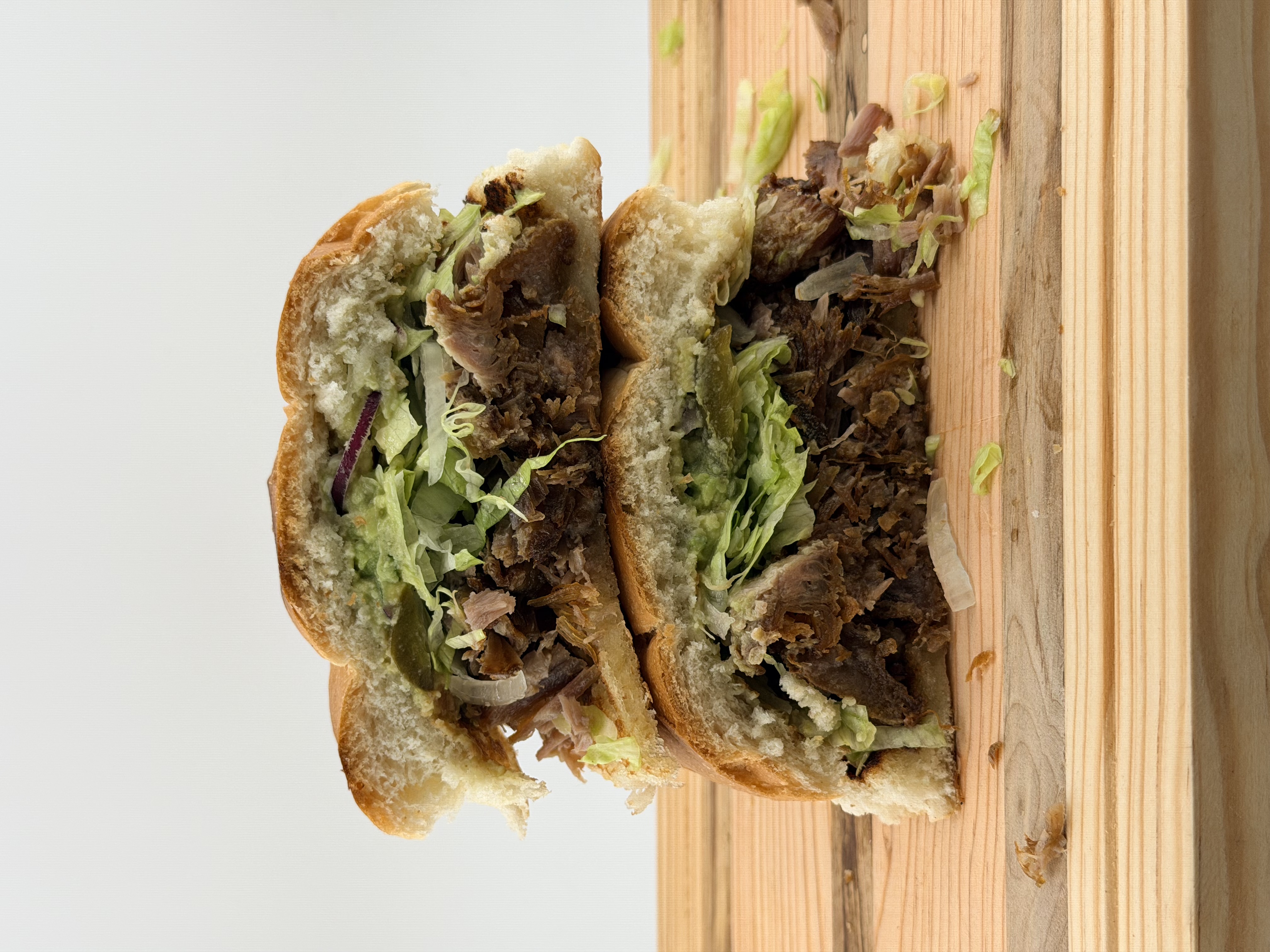 Telera, carne, crema, lechuga, jitomate, cebolla, aguacate, jalapenos.